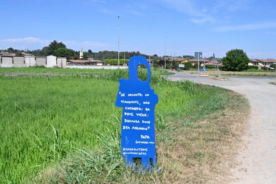 Vandaag gewandeld van Corte Sant'Andrea naar Piacenza. Iets van 25 km ongeveer. Lijkt in alles op het Land van Maas en Waal. Je loopt op de dijk met rechts en links akkers. Het enige verschil is dat het veel warmer is en de percelen veel groter zijn. Belangrijkste verschil is verder dat het vooral veel rustiger is. Ik denk dat ik de eerste drie of vier uur gewoon helemaal niemand heb gezien. Misschien met uitzondering van een paar tractors, die bezig zijn met het bewateren van de maïs.