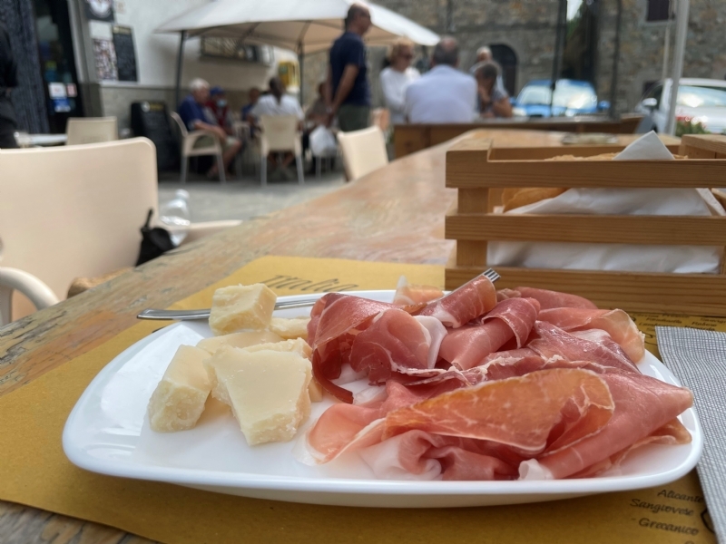 En zat vandaag iets mee en er zat iets tegen. Wat tegenzit was de wandeling. En dan met name de duur in uren daarvan. Bijna 30 km is al niet weinig, maar met de hoogteverschillen in de ochtend en vooral de eerste helft tot ongeveer 12 uur was het echt wel zwaar. Gevoelsmatig liep je soms 10 meter om dan weer 100 meter stil te staan. Niet gek dat ik bij mijn eerste echte pauze om 12 uur iets minder dan 20 kilometer achter de kiezen had (3 km p/ uur!!). Gelukkig zat er ook iets mee. Het weer was veel koeler dan de afgelopen dagen. En de zon stond niet hele tijd op je kop te rammen. Daarnaast mochten we nu hele stukken door het bos lopen. Dat had ik op deze Via Francigena route nog niet meegemaakt . De eerste echte pauze was in het dorpje Cassio. Leuke bar en heb mij zelf uitgebreid getrakteerd op een schaal met prosciutto crudo en Parmesana. Super lekker en dubbel en dwars verdiend.