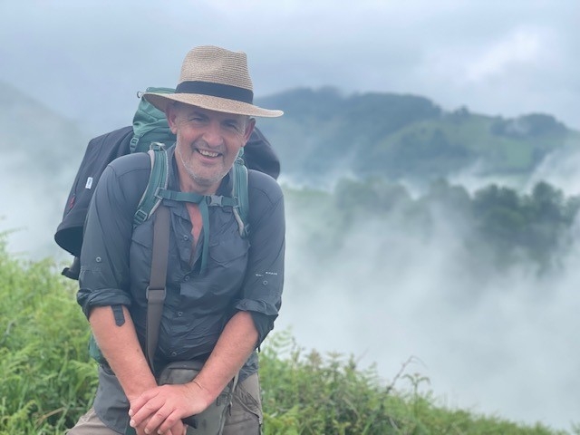 Door dat wandelen wordt je wel anders. Je wordt wat sensitiever van inslag. Ik weet niet hoe dat komt. Waarschijnlijk omdat je de hele dag redelijk intensief met jezelf zit opgezadeld en je wereldje veel kleiner is als normaal. In het normale leven moet je werken, dingen doen in het huis en ga zo maar door. Hier hoef je alleen maar te lopen en van de omgeving en je gezelschap te genieten. Als ik dan naar het thuisfront een foto stuur van mezelf in de mist en daar komt een lief commentaar op: 'Prachtig om jou daar zo te zien' moest ik wel een traantje wegpinken.