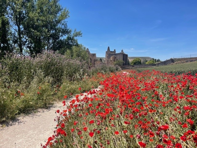 Vandaag hebben we voor het eerst kennisgemaakt met de beroemde en beruchte meseta. Waar dat in twee eerdere camino's vooral een dorre bende was, was het nu een grote kleurenexplosie. Over een paar weken, als het nog wat heter wordt en al het graan van het land wordt gehaald, zijn al die kleuren verdwenen. Maar nu zijn ze er gelukkig wel. Iedereen die je erover spreekt, heeft het erover. Ik zit dit blogje te tikken naast Gilbert, een Franse pelgrim van ongeveer mijn leeftijd. Hij vatte het heel compact samen: "C